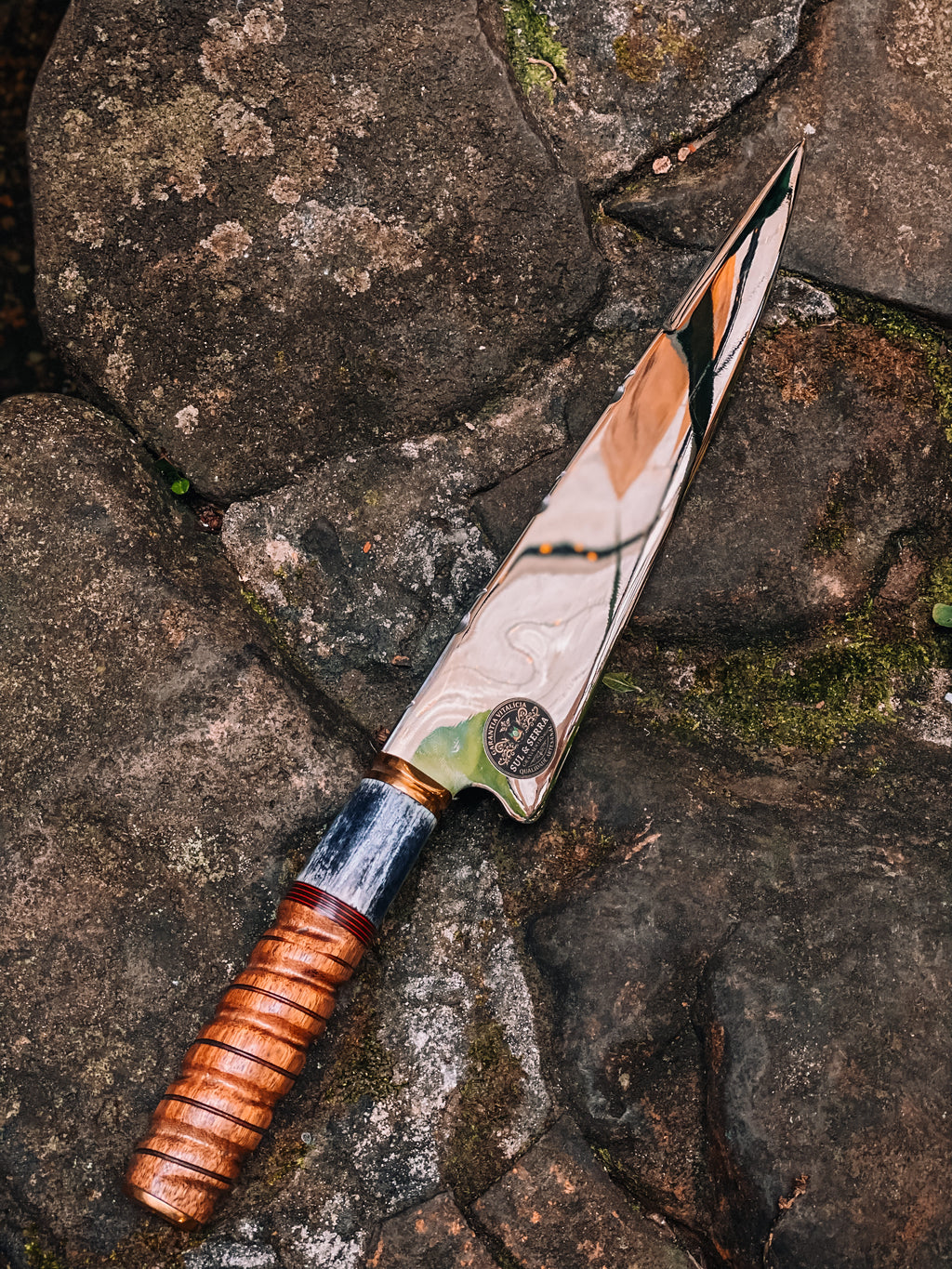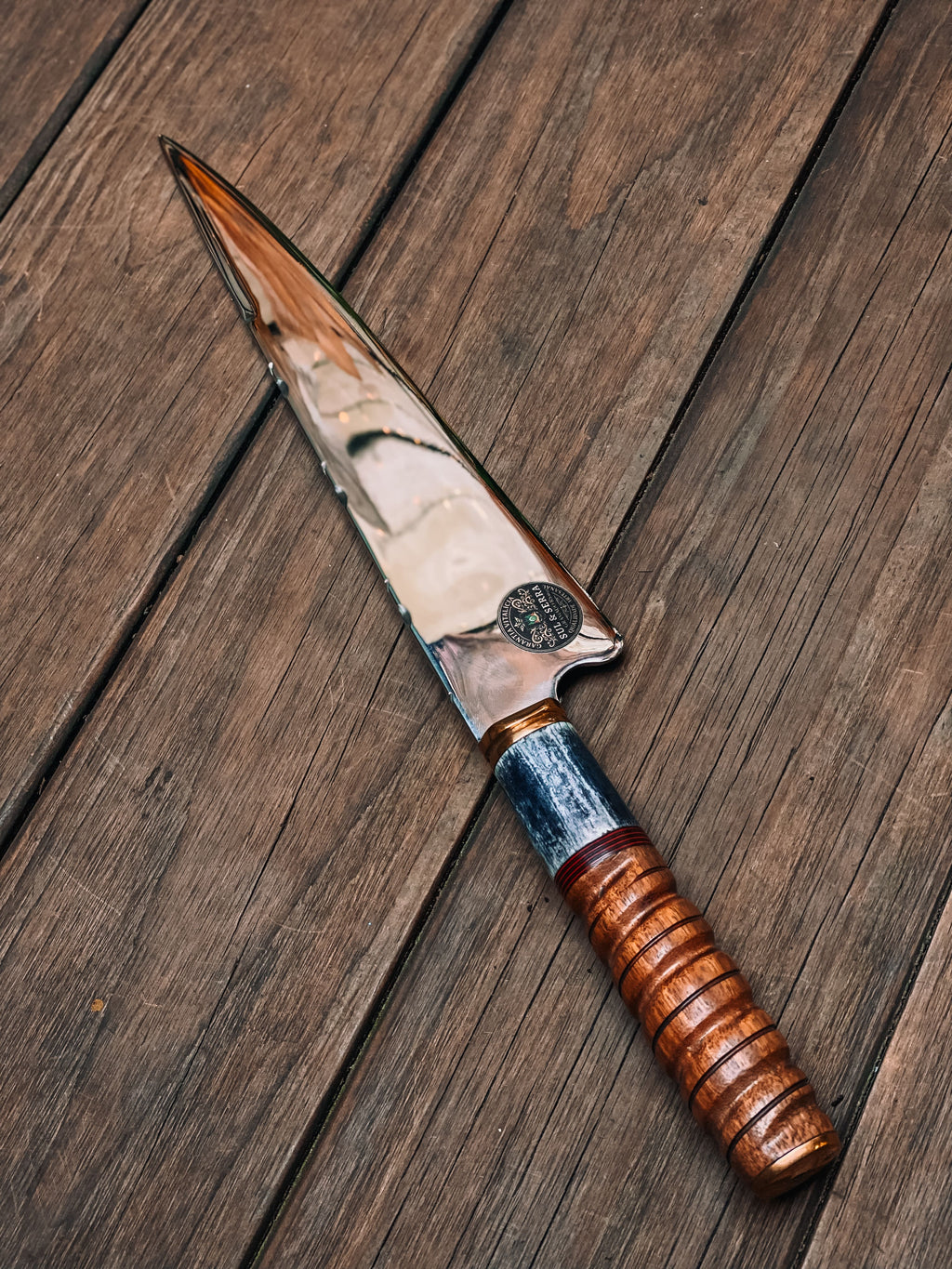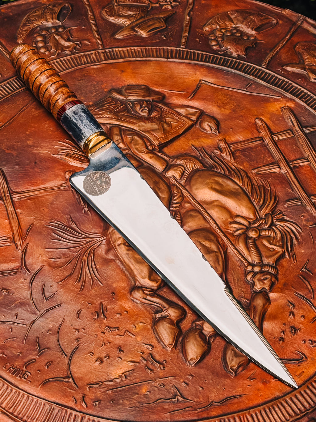 Esta faca é a materialização da tradição do churrasco com execução artesanal refinada. A lâmina de 10 polegadas, com 3,5 mm de dorso, entrega rigidez ideal e controle preciso em cortes exigentes, tornando-a uma escolha confiável para trabalhos com carnes. O cabo em madeira e osso torneado confere textura natural, resistência e adaptação ergonômica ao longo do uso, sem artifícios desnecessários — o design foca na substância e na performance direta.
